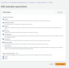 You can go to the Amazon SES Console, but before anything, be sure to select the correct region. Afterwards, you can click on Configuration Sets, choose the set to edit, and add/edit your settings on the Event destinations tab. Open/Click tracking can be enabled by ticking the checkbox and will instantly start working for every new email that's being sent out by Amazon SES.