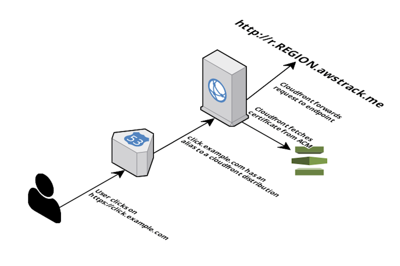 While setting up open/click tracking is relatively simple for HTTP, setting it up to support HTTPS can be a bit more cumbersome. The Amazon SES Setup Documentation includes pretty extensive information on the setup to support this, however, this also includes setting up a CloudFront distribution with Amazon Certificate Manager, and using the http://r.REGION.awstrack.me as an origin.