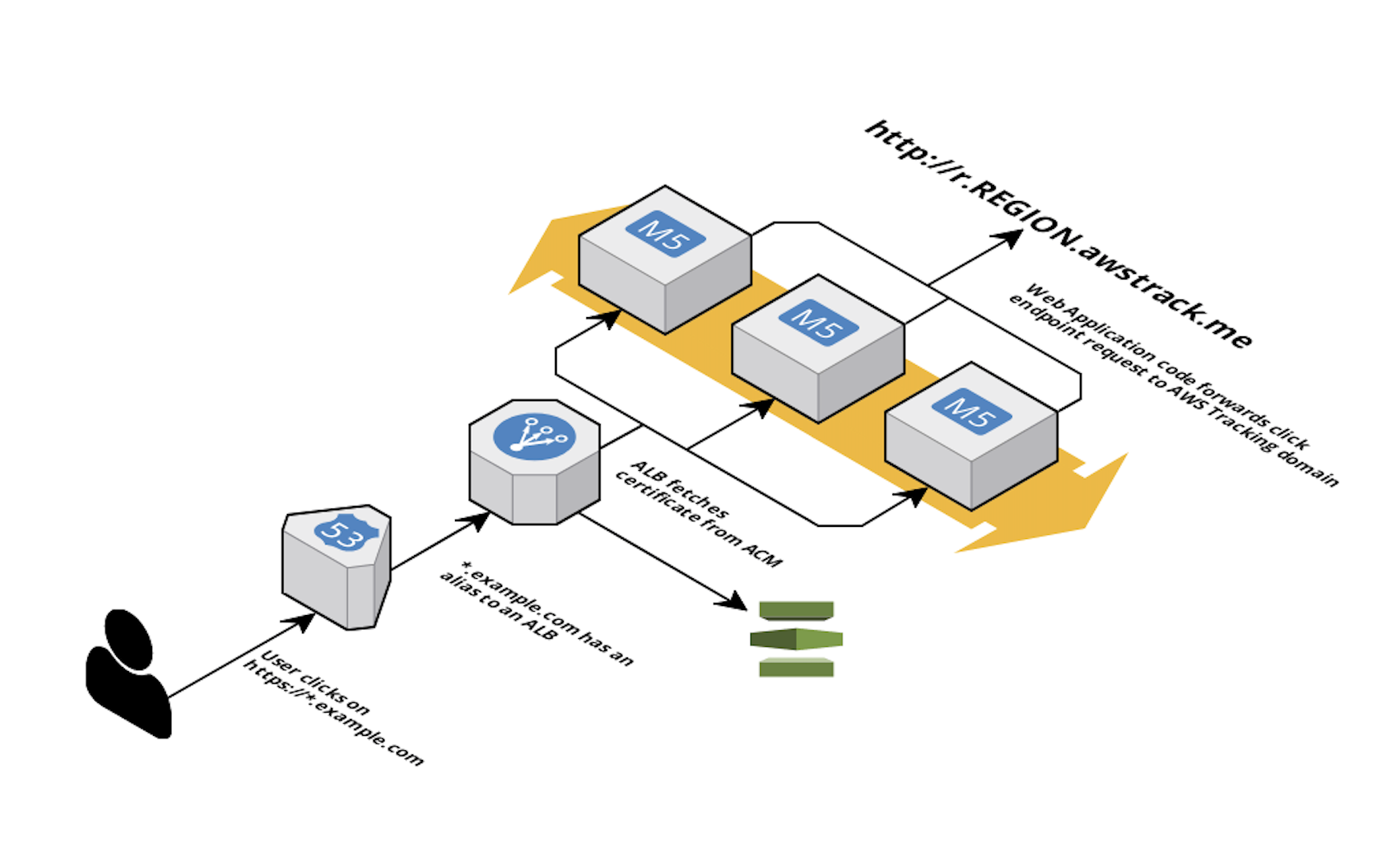 Let’s throw this into a schematic overview. As you can see on the left, we already have an existing application already supported by HTTPS. In our example use case, we use an Application Load Balancer in combination with Amazon Certificate Manager to support this. Keep in mind that you can also use a single EC2 machine with LetsEncrypt or HAProxy. The idea remains the same, we will use our existing HTTPS supported web application as a HTTPS Proxy for our open/click tracking.