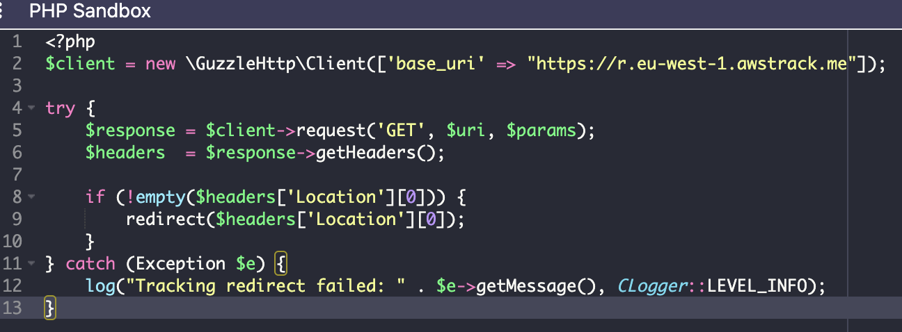Next up is making sure your application can redirect the requests that happen from click.example.com to http://r.REGION.awstrack.me. This completely depends on your application. In my example code I will use a PHP framework, which can redirect everything from click.example.com, to a separate controller. In this controller, we are then able to forward the requests.